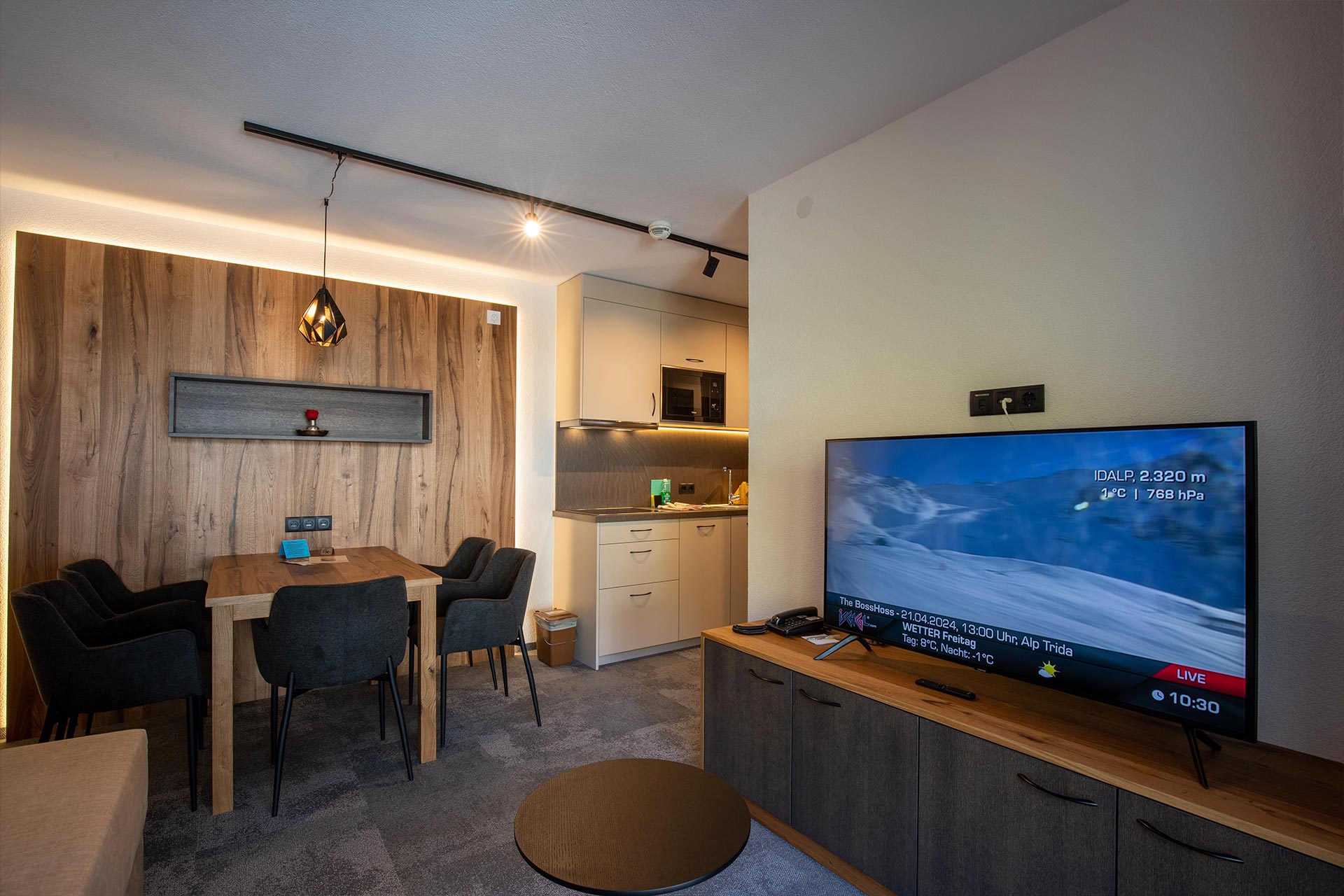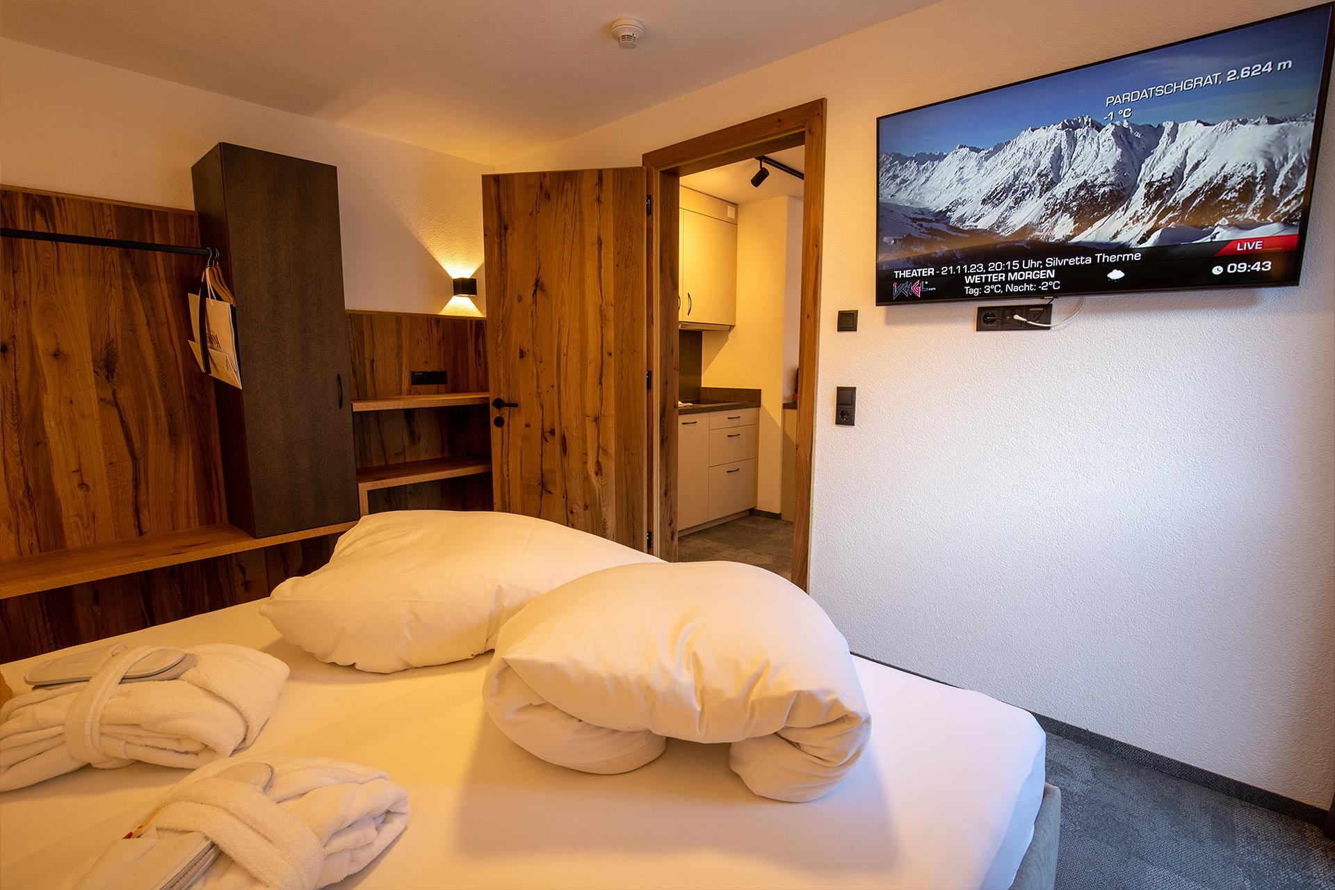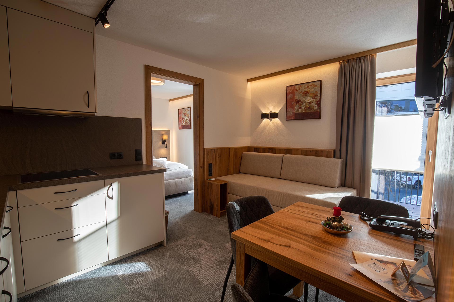 1 Schlafzimmer, Wohnküche, Dusche, WC, Balkon, Telefon, 2 Kabel-TV, kostenloses W-LAN, Haarfön und Safe.