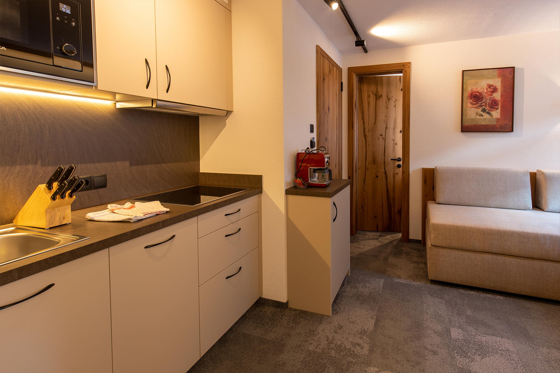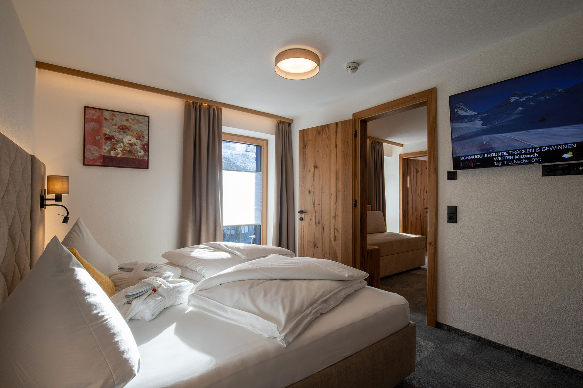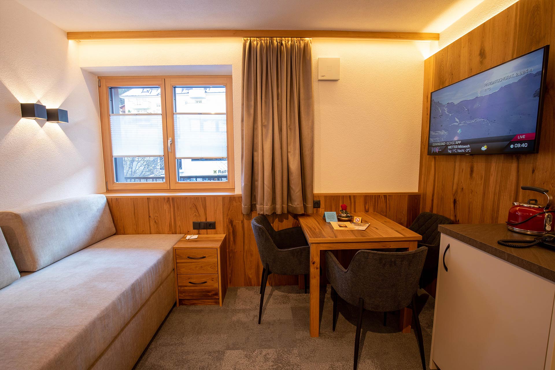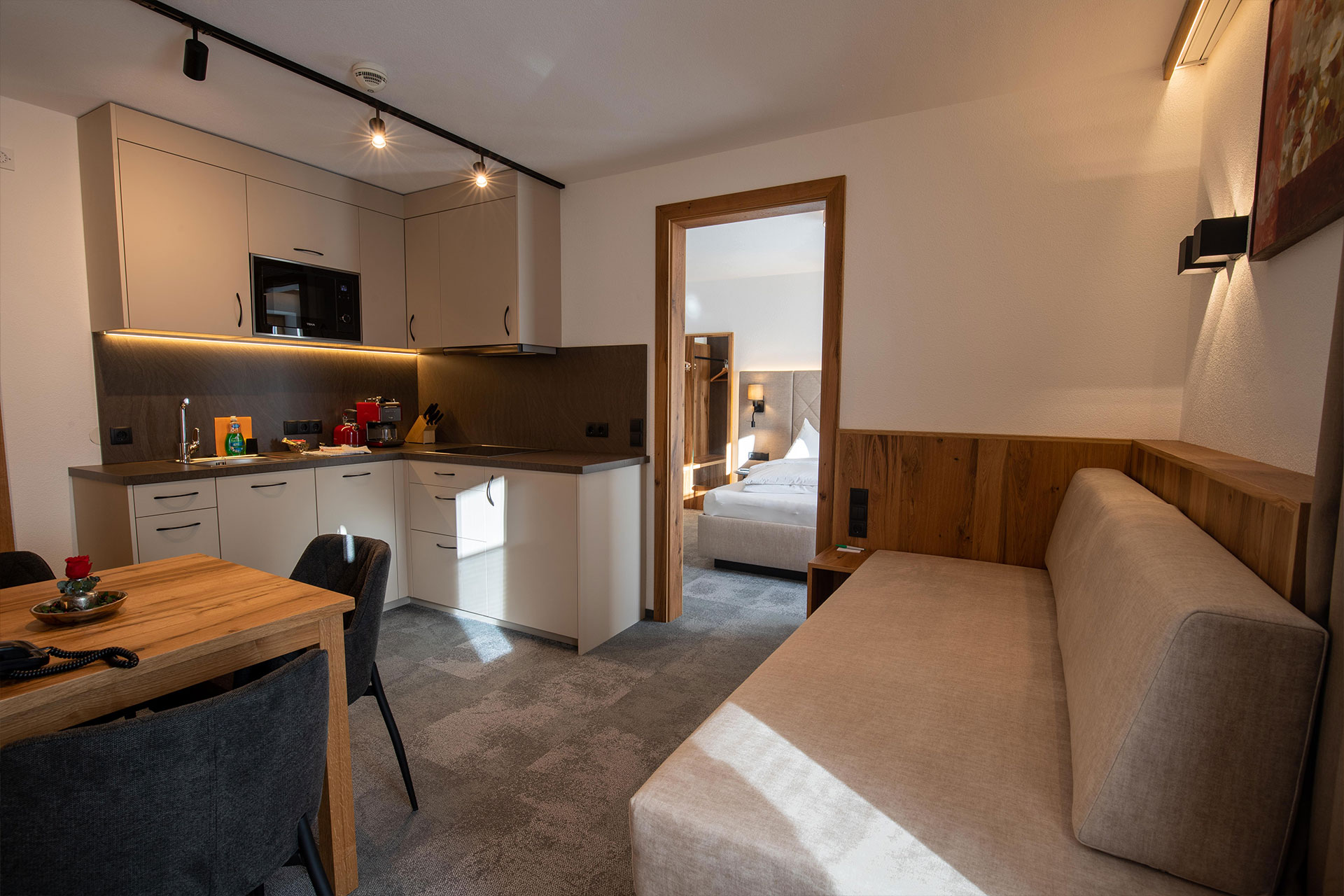 1 Schlafzimmer, Wohnküche, Dusche, WC, Balkon, Telefon, 2 Kabel-TV, kostenloses W-LAN, Haarfön und Safe.