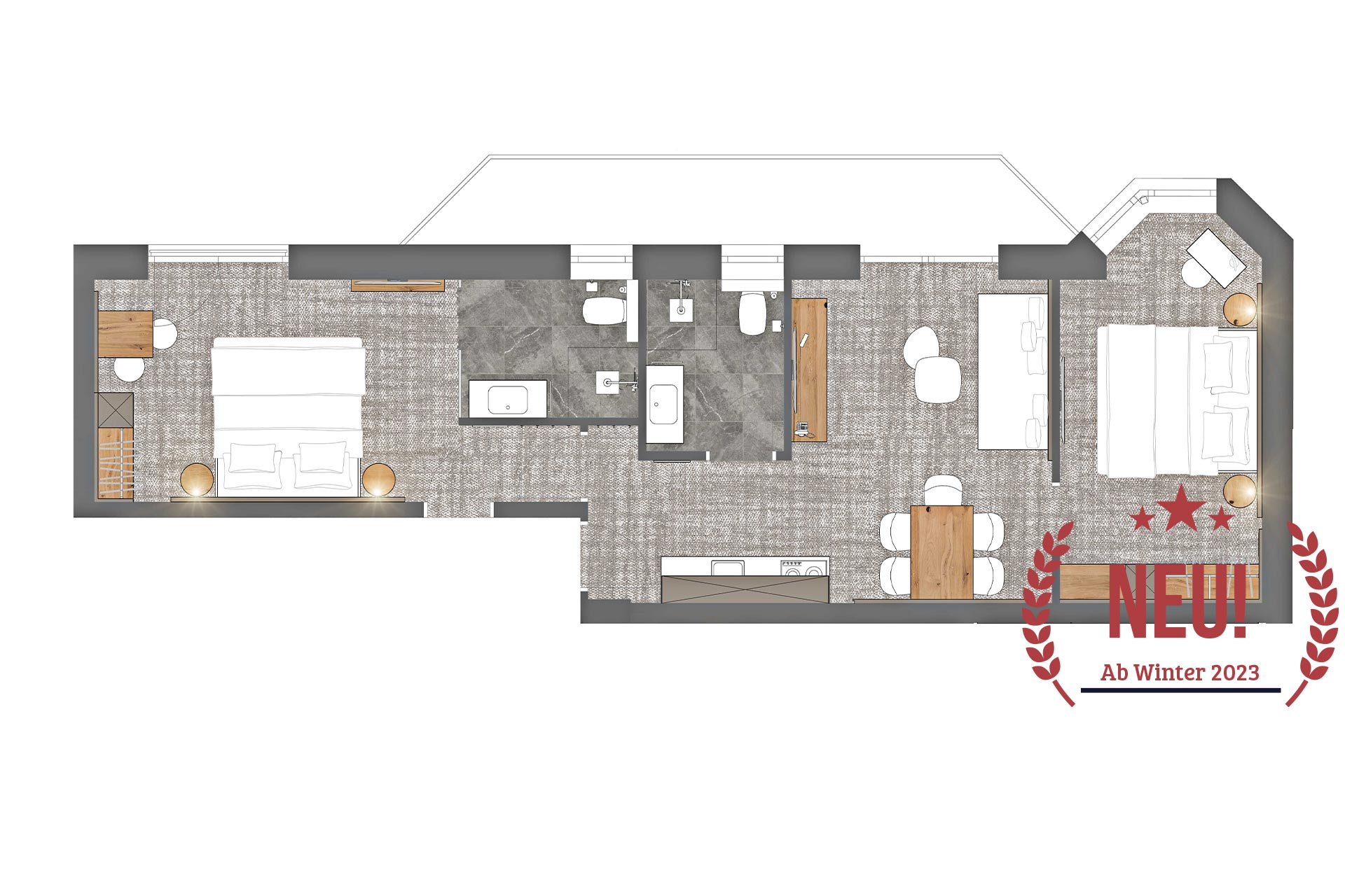 3 Schlafzimmer für je 2 Pers. Jedes Zimmer mit eigener Dusche, WC, Balkon, Telefon, 4 Kabel-TV, kostenloses W-LAN, Haarfön und Safe, Wohn-Esszimmer und Küche.
